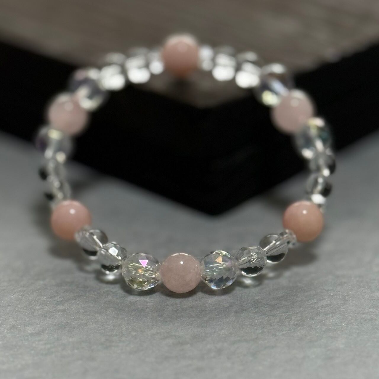 ピンクオパールとローズクォーツの柔らかく優しいエネルギーが心を包み込み、オーロラ水晶の虹色の輝きが明るい未来を感じさせてくれます。